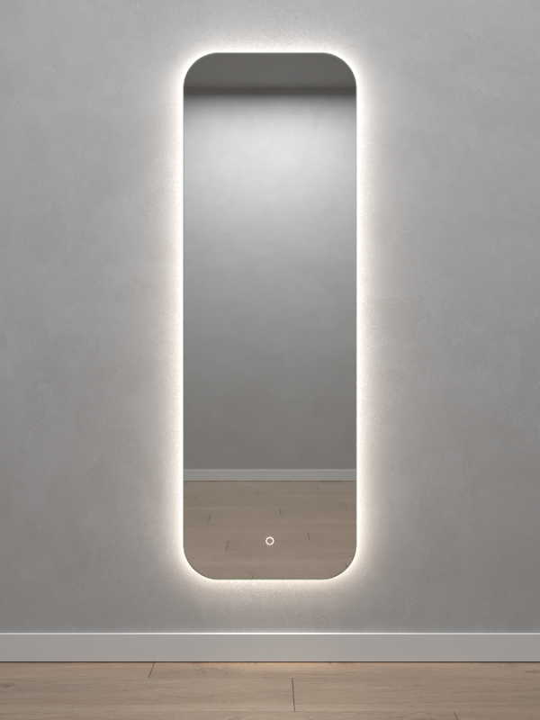 Безрамное зеркало прямоугольной формы с контурной (тыльной) нейтральной подсветкой, свет 4000К. Подложка из высококачественного МДФ, светодиодная лента защищена матовым свето-рассеивателем от попадания пыли и влаги. Есть вывод 220W для подключения к сети, включение подсветки от сенсорной кнопки на зеркале, её расположение на зеркале можно выбрать на заказ.